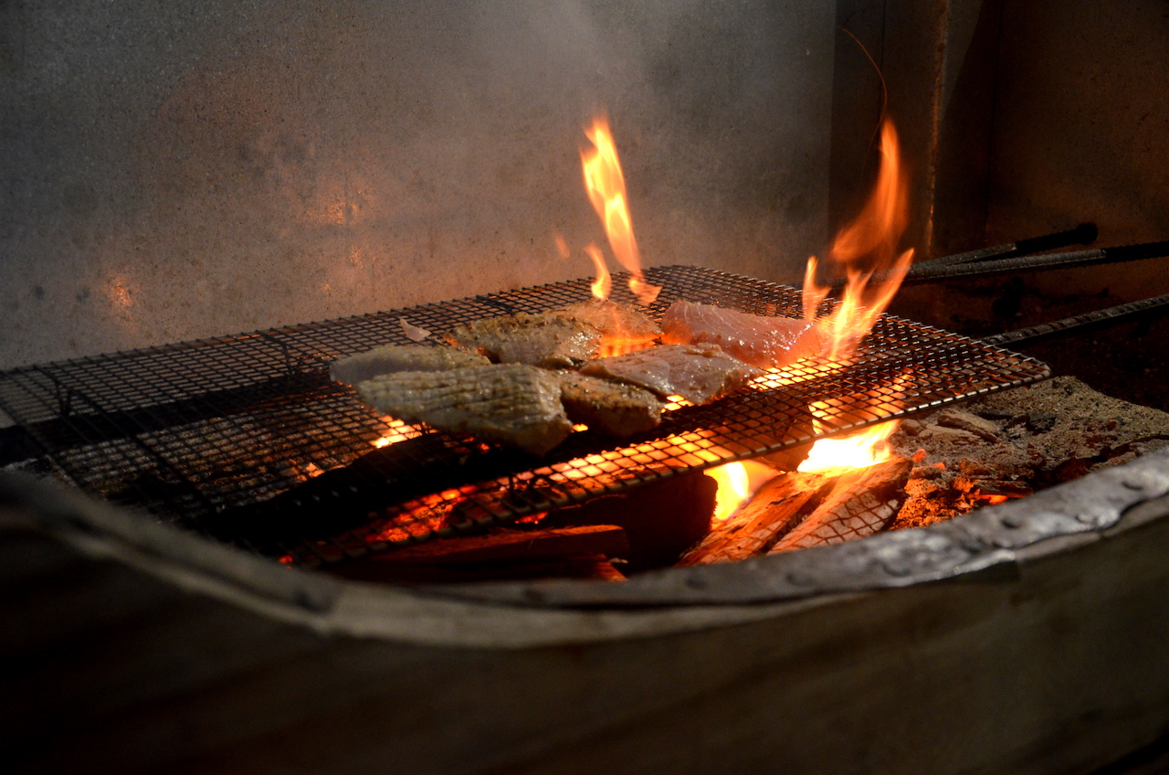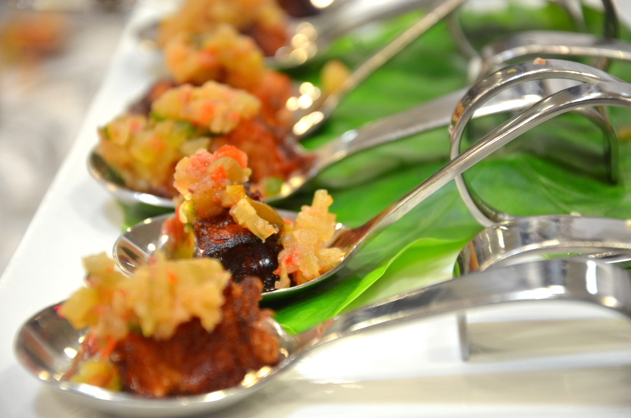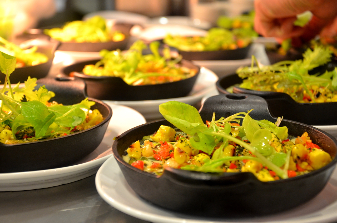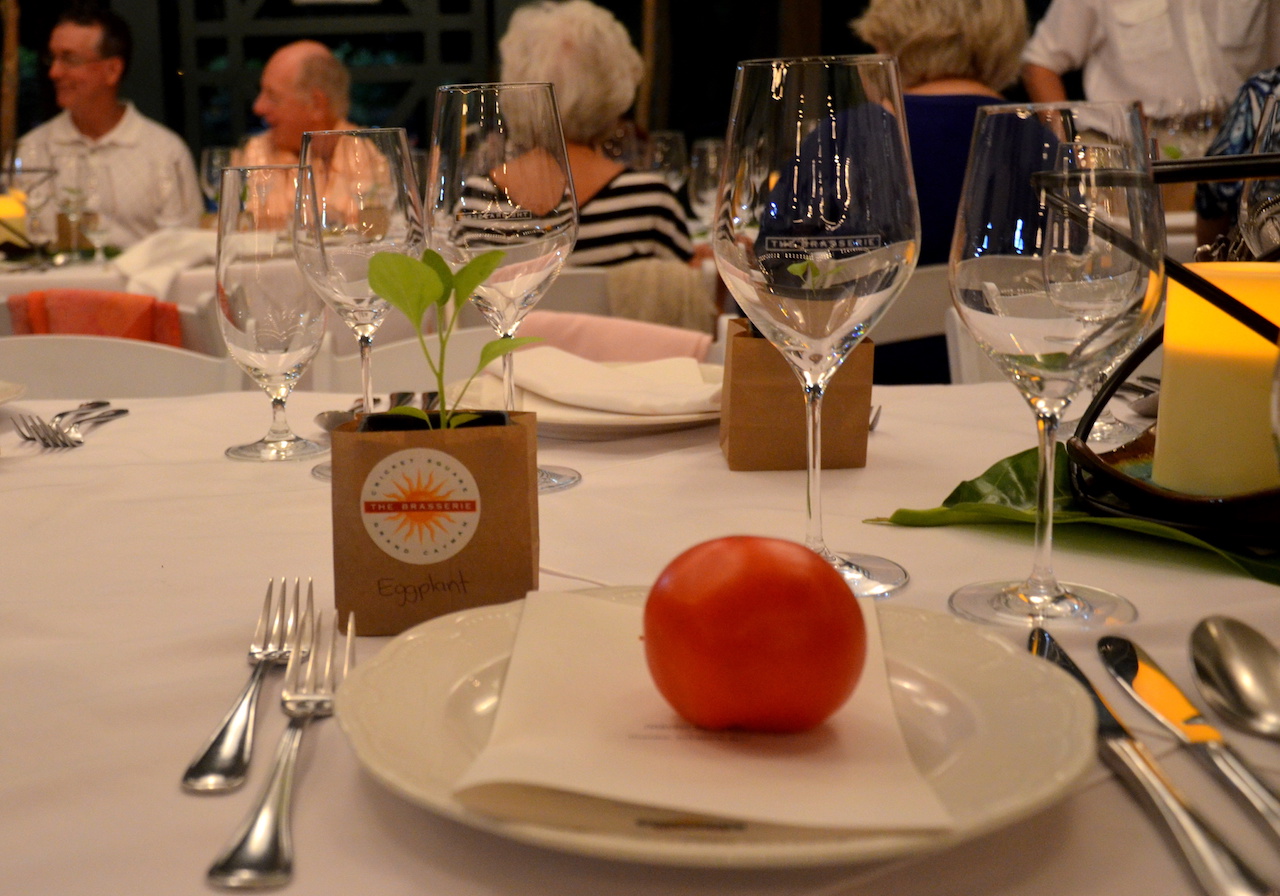 Bright colorful mountains of green papaya salad, Cayman tomato, garden cucumber and green beans topped with crispy local breadfruit, peanuts and herbs were served, followed by Farmer Adrian’s delicious chicken and miso-marinated ‘Brasserie Catch’ swordfish grilled in traditional style on the caboose